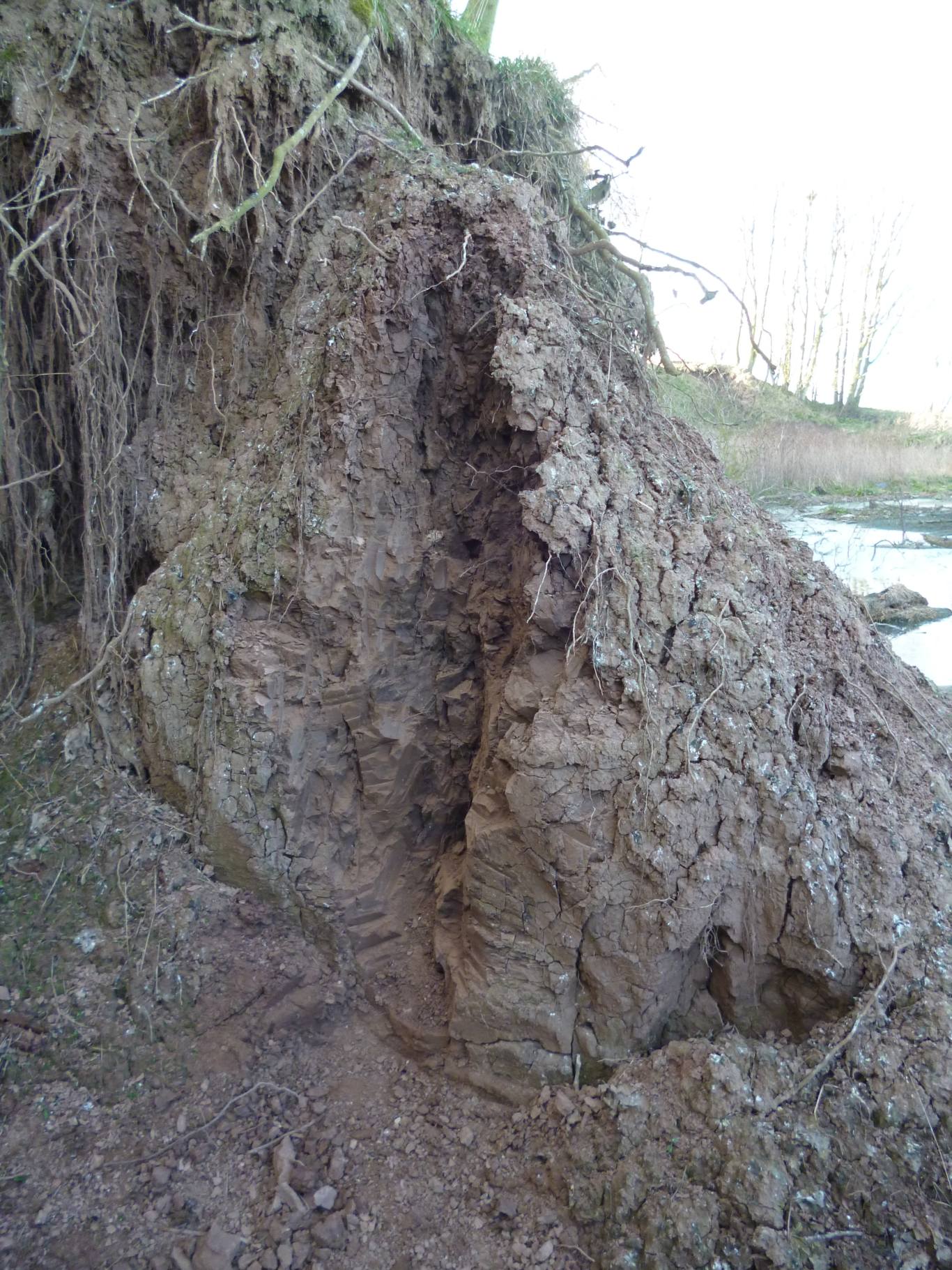 The clay is from a raised marine deposit, around 30000 years old. The clay, prob­a­bly along with oth­er mate­ri­als, was washed out to sea and the par­ti­cles of a sim­i­lar size were set­tled out in lay­ers. The lay­ers can clear­ly be seen in ‘clean’ sam­ples of the clay, where more recent wind and rain has­n’t got to it.
